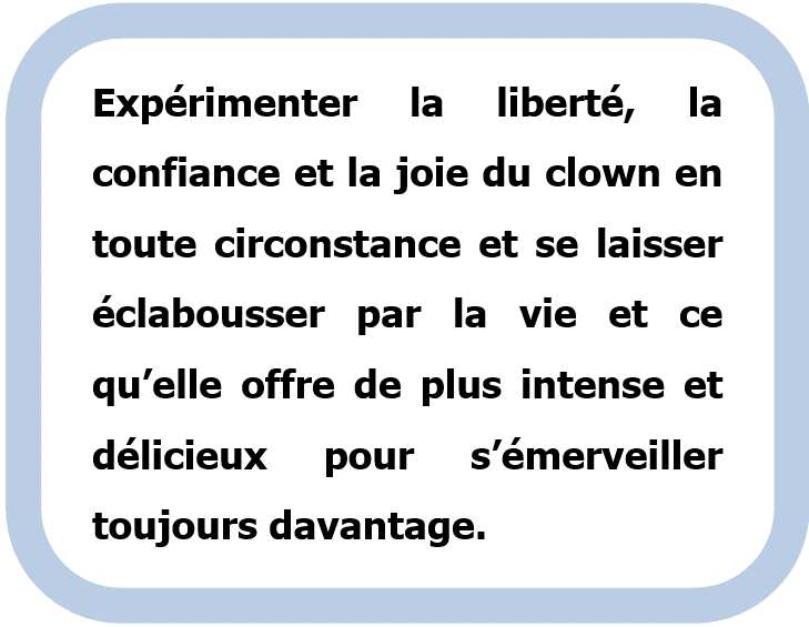 Expérimenter la liberté, la confiance et la joie du clown en toute circonstance et se laisser éclabousser par la vie et ce qu’elle offre de plus intense et délicieux pour s’émerveiller toujours davantage.