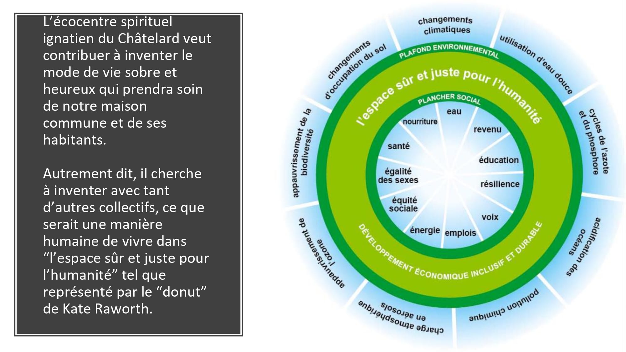 Sur ces chemins partagés, l’expérience montre que de nombreux chrétiens attendent de la spiritualité ignatienne une aide pour discerner leur place en ces temps de crise écologique et sociale. Pour cela la tradition des Exercices spirituels, un art de l’accompagnement respectueux de chacun, une relation vivante à la Création et une sobriété heureuse vécue concrètement peuvent être partagés aux retraitants dans un Centre spirituel en Transition.