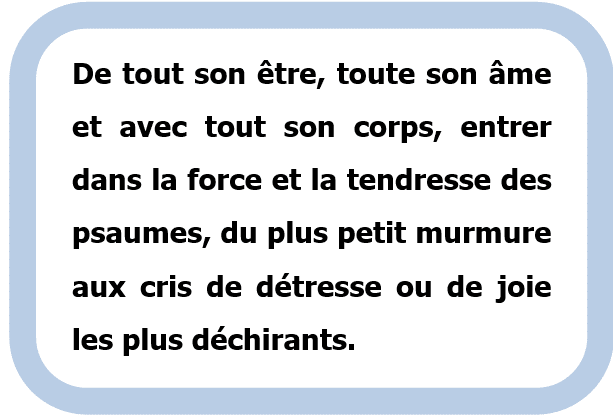 De tout son être, toute son âme et avec tout son corps, entrer dans la force et la tendresse des psaumes, du plus petit murmure aux cris de détresse ou de joie les plus déchirants.