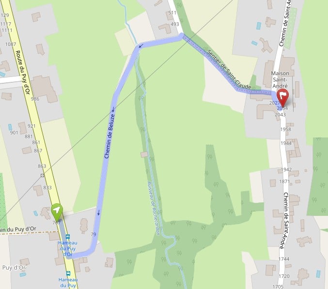 - Descendre à l’arrêt du Hameau du Puy d’Or. Il vous reste 750m à parcourir à pied (15′ environ) :